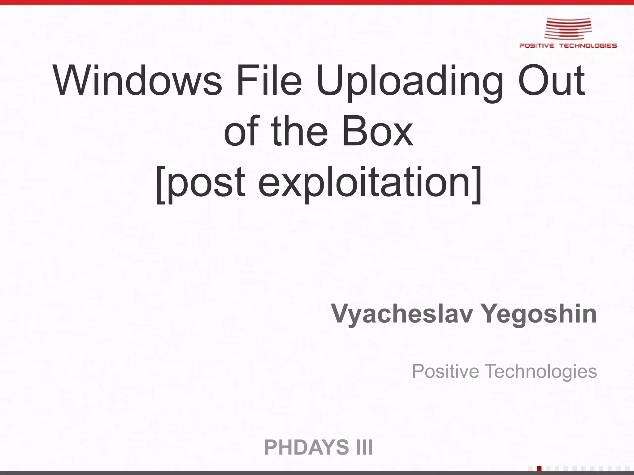 This document discusses various techniques for uploading files and executing commands on Windows systems without requiring any open TCP or UDP ports. It begins by covering built-in Windows utilities like FTP, TFTP, Telnet and NSLookup that can be used for this purpose. It then explores using PowerShell, JScript/VBScript, Windows Script Files and the Microsoft HTML Application (MSHTA) to execute commands and upload files over various protocols. The document demonstrates how these techniques can be used to conduct port scans and send files/commands via DNS records. It concludes with comparisons of using WebDAV versus Samba for file uploading and command execution.