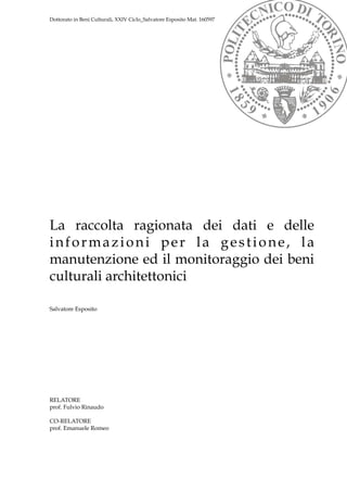 La tesi di dottorato di Salvatore Esposito esplora la raccolta e gestione dei dati per la manutenzione e monitoraggio dei beni culturali architettonici, sottolineando l'importanza della registrazione delle informazioni come parte integrante delle politiche di conservazione. Si evidenzia come l'uso della tecnologia informatica sia fondamentale per migliorare questi processi e viene presentato un caso studio sul Castello di Serralunga d'Alba. L'opera si inserisce in un contesto normativo aggiornato, evidenziando la necessità di interventi sistematici per garantire la salvaguardia del patrimonio culturale.