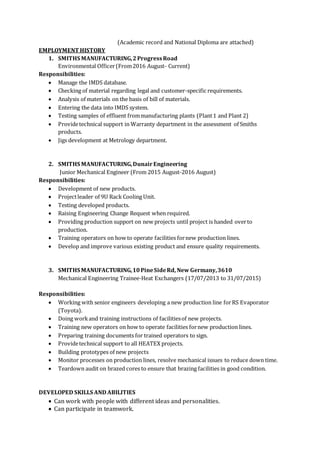 This document is a curriculum vitae for Phelelani Mkhize. It includes his contact details, personal details, academic qualifications, and employment history. Phelelani has a B-Tech in Mechanical Engineering from UNISA and a National Diploma in Mechanical Engineering. He currently works as an Environmental Officer at Smiths Manufacturing, where he has also previously worked as a Junior Mechanical Engineer and Mechanical Engineering Trainee. His roles have included product development, testing, training operators, and providing technical support. The CV lists his skills and three references.