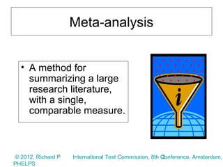 1) The document summarizes a 12-year meta-analysis of nearly 700 studies and over 1,600 effects analyzing the impact of testing on student achievement from 1910-2010.