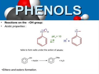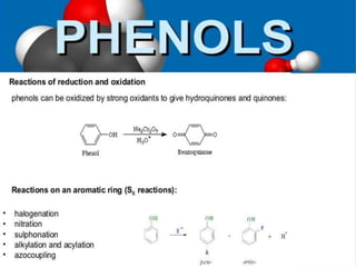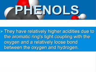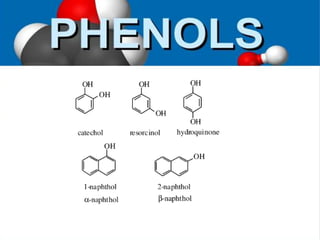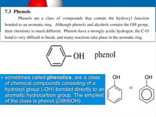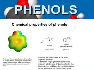 Phenol and its derivatives have both IUPAC and common names. Phenol is a white crystalline solid that is hazardous to skin. It has higher melting and boiling points than toluene due to hydrogen bonding between phenol molecules. Phenol is moderately soluble in water and weakly acidic. Major uses of phenol involve its conversion to plastics, resins, nylon precursors, and drugs like aspirin. It is also used as a throat pain reliever and in nucleic acid extractions.