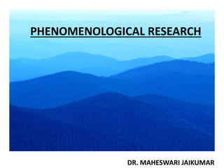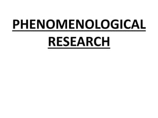 Phenomenological research examines human experiences through descriptions provided by those involved. It aims to understand the relationship between individual consciousness and social life, and uncover how awareness shapes social actions and worlds. Phenomenological studies trace lived experiences of people to generate theories about phenomena. Data is primarily collected through interviews and analyzed to identify patterns and themes in a clear manner. There are different types including realistic, constitutive, existential, and hermeneutic phenomenological research.
