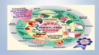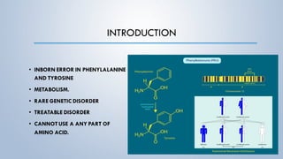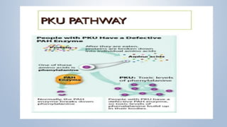 This document discusses phenylketonuria (PKU), a rare genetic disorder caused by mutations in the PAH gene that prevents the conversion of phenylalanine to tyrosine. This leads to a toxic buildup of phenylalanine in the body. PKU is diagnosed through newborn screening and confirmed with blood tests measuring phenylalanine levels. Treatment involves a lifelong low-phenylalanine diet to prevent intellectual disabilities and other health issues. If left untreated, PKU can cause issues such as low IQ, seizures, behavioral problems, and eczema. Early diagnosis and dietary treatment can help patients with PKU live healthy lives.