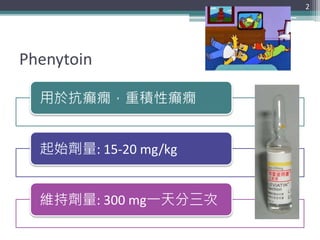 文档讨论了phenytoin的使用、监测及其与抗癫痫效果的相关性,强调个体化剂量和药物相互作用的重要性。提到不良反应与药物浓度相关,且需依照病人状况为指导。监测的时间点应依据临床情况进行调整,以确保治疗效果和避免副作用。