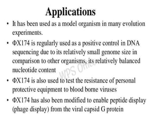 This document discusses the bacterial virus Phi X 174 phage. It begins with an introduction to bacteriophages and their discovery. It then provides the taxonomic classification of Phi X 174, placing it in the family Microviridae. The document outlines the history of Phi X 174, including its early study and sequencing. It describes the morphology and genome organization of Phi X 174, including its circular single-stranded DNA genome of 5386 nucleotides that encodes 10 genes and 11 proteins. The life cycle of Phi X 174 is summarized, from attachment and entry, to replication, assembly of mature virions, and release through cell lysis.
