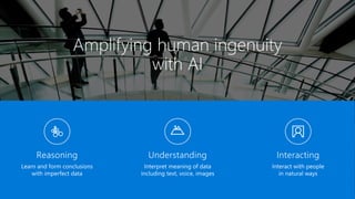 2) Microsoft's approach to AI includes developing frameworks and models while also providing AI services on Azure. Their goal is to make AI accessible to developers and organizations.