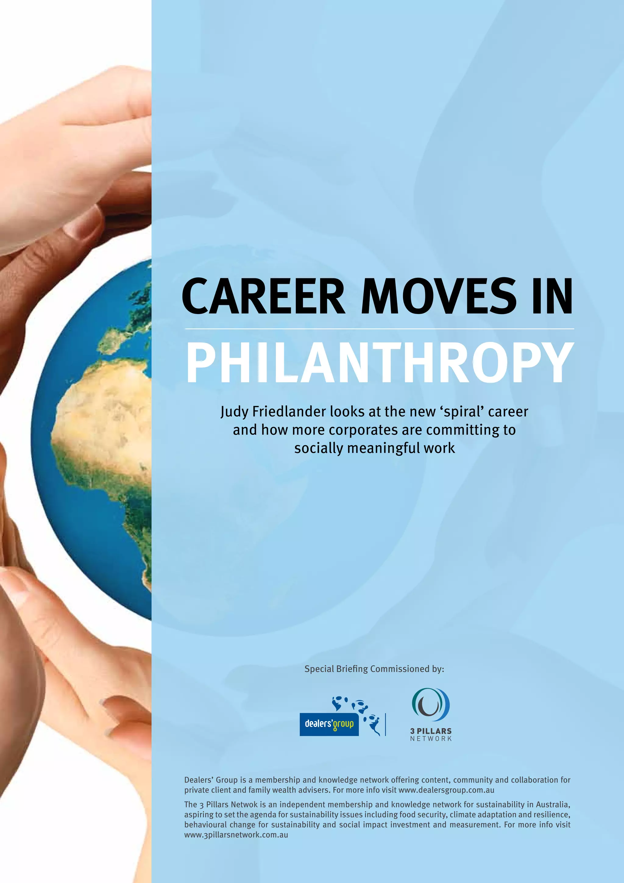 The document discusses a trend of corporate executives moving into philanthropic careers as they seek more socially meaningful work, noting examples like Andrew Forrest and Simon McKeon. Research finds these career changers are motivated more by a desire to make an impact rather than prestige or money. The shift is helping boost innovative philanthropic approaches like social finance that aim to achieve both social and financial returns.