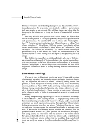 The article examines the evolution and future of philanthropy in the context of emerging changes that affect charitable giving. It discusses the historical roots of philanthropy, categorizes philanthropic activities, and identifies key emerging issues that may transform philanthropic intent, infrastructure, and targeted issues. The essay highlights the importance of understanding the changing motivations and resources affecting givers, influenced by cultural and demographic shifts, technological advancements, and evolving societal values.
