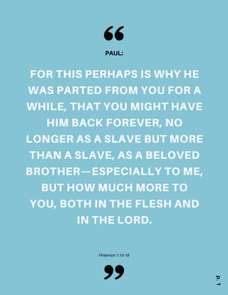 Onesimus, a runaway slave, finds faith in Christ after meeting Paul in prison. Paul writes a letter to Philemon, Onesimus' owner, asking him to accept Onesimus back not as a slave but as a beloved brother. Paul's letter promotes reconciliation between Onesimus and Philemon through their shared faith. It also hints at Paul's own reconciliation with Mark, who had previously abandoned Paul on a missionary journey, as the two now work together again in ministry. The book of Philemon models how faith in Christ can overcome divisions and foster forgiveness and community.