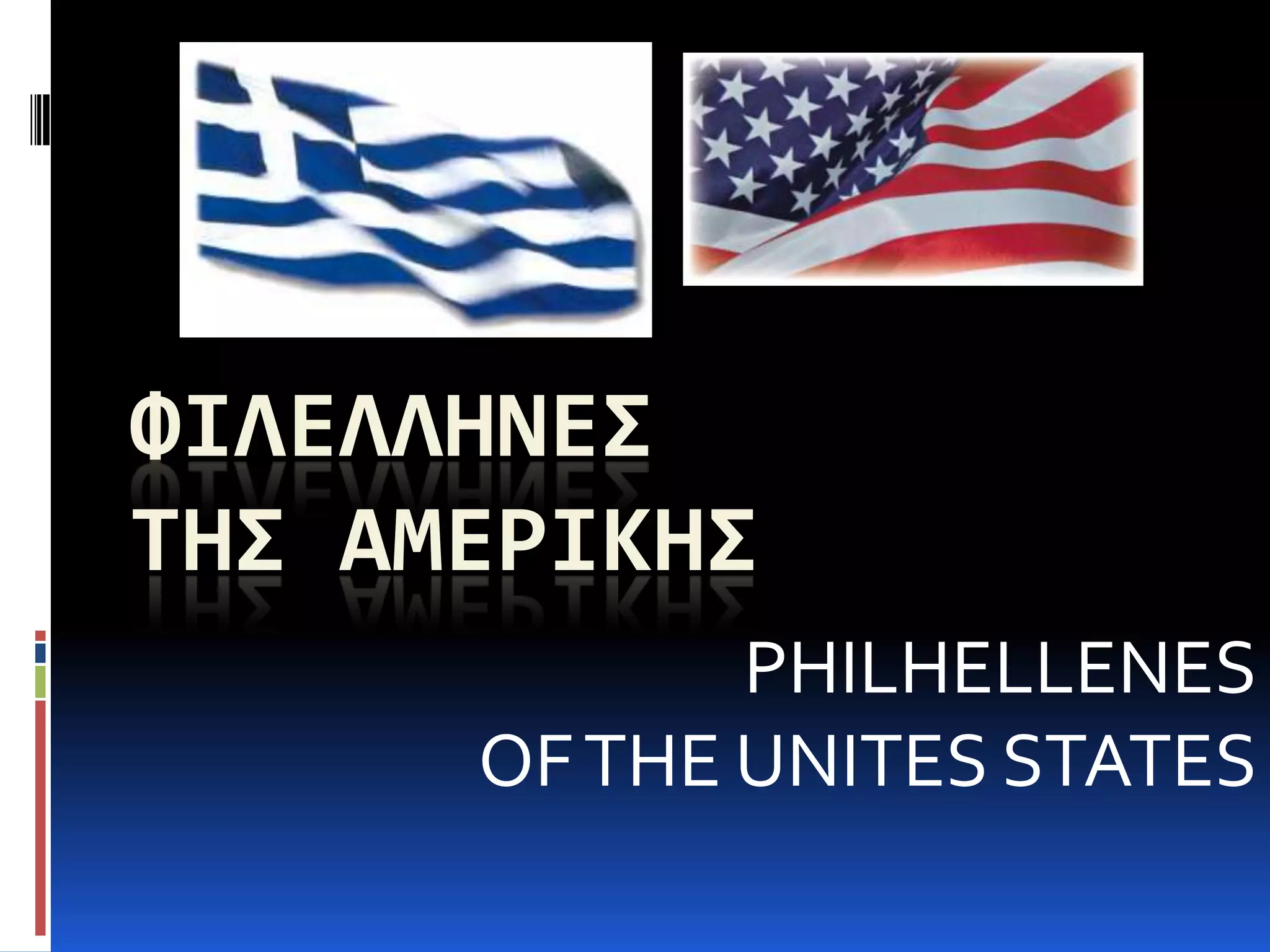 This document provides information about American philhellenes (friends of Greece) who supported Greek independence from the Ottoman Empire during the Greek War of Independence in the early 19th century. It discusses several Americans who traveled to Greece to fight, including George Jarvis, the first American volunteer. It also mentions Americans who supported the cause financially or politically, such as Edward Everett who helped publicize Greek appeals for aid. Overall, the document honors American contributions to the Greek independence movement through soldiers, doctors, politicians, and financial assistance.