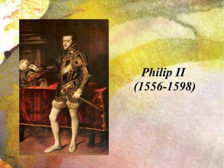 3) Philip II ruled over a vast global Spanish Empire but faced ongoing conflicts including wars against Protestants, Muslims, England, and France throughout his reign from 1556 to 1598.