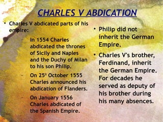 1) King Charles V abdicated parts of his empire to his son Philip II in 1554-1556, including Spain and the Netherlands but not the German Empire, which passed to Ferdinand.