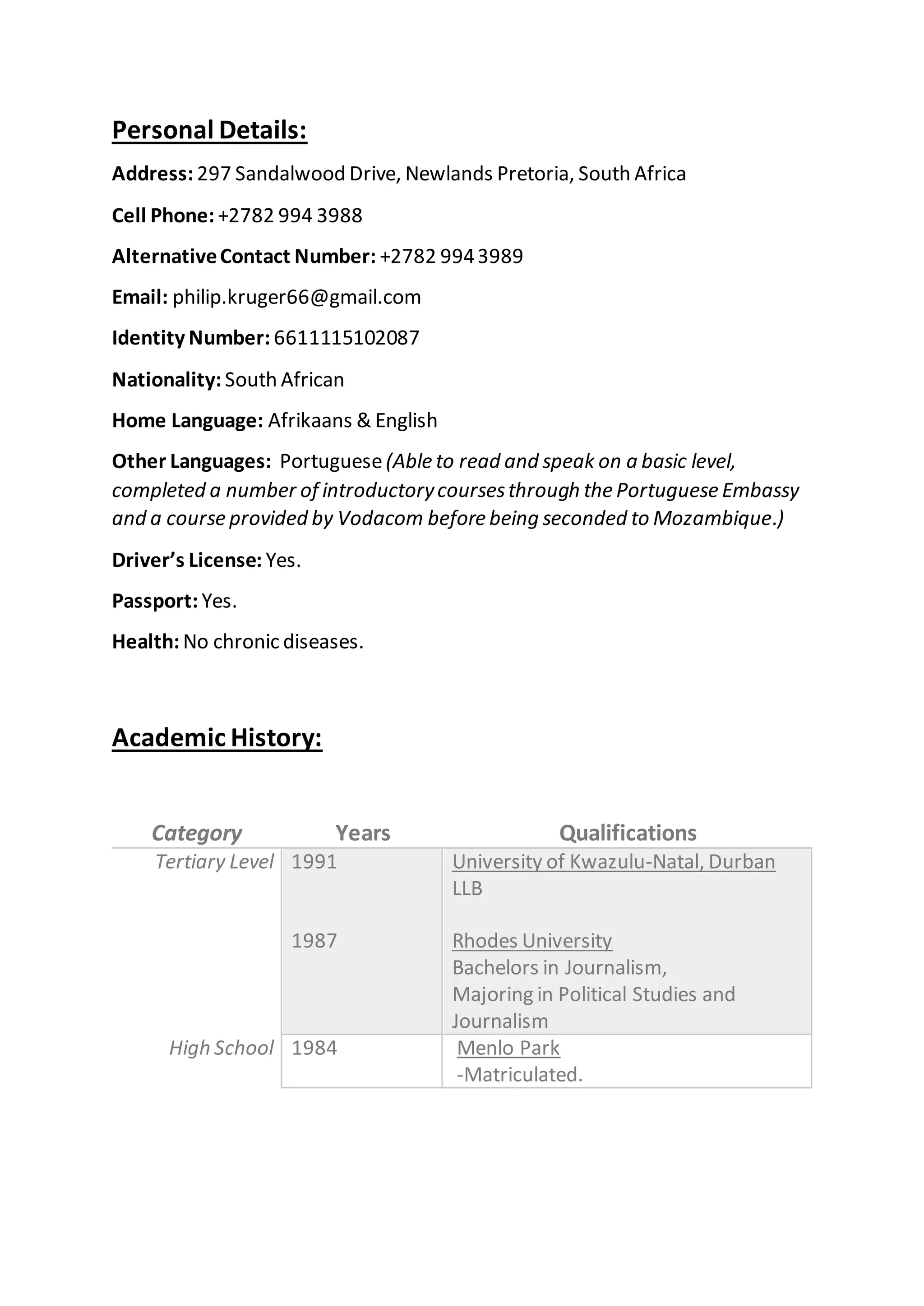 Philip Kruger has over 20 years of experience in legal and regulatory roles within the telecommunications industry. He has worked for Vodacom Group since 2001, holding positions in Mozambique, Tanzania, Lesotho and South Africa. Most recently, he was the Executive Head of Department at Vodacom Group Headquarters, overseeing international regulatory activities. He holds degrees in Law and Journalism from the University of Kwazulu-Natal and Rhodes University. Kruger is skilled in legal research, contract management, regulatory compliance, and training. He seeks a new position within the legal regulatory department of an organization.