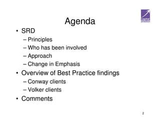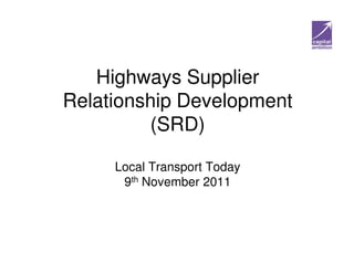 The document discusses the development of supplier relationships in the context of highways management, highlighting the principles, involved parties, and a strategic approach to enhancing efficiencies. It outlines best practices drawn from various client experiences and presents a strategy for improving contract behaviors and achieving cost savings. Key challenges include contractor reluctance for savings and the effective utilization of technology in asset management.