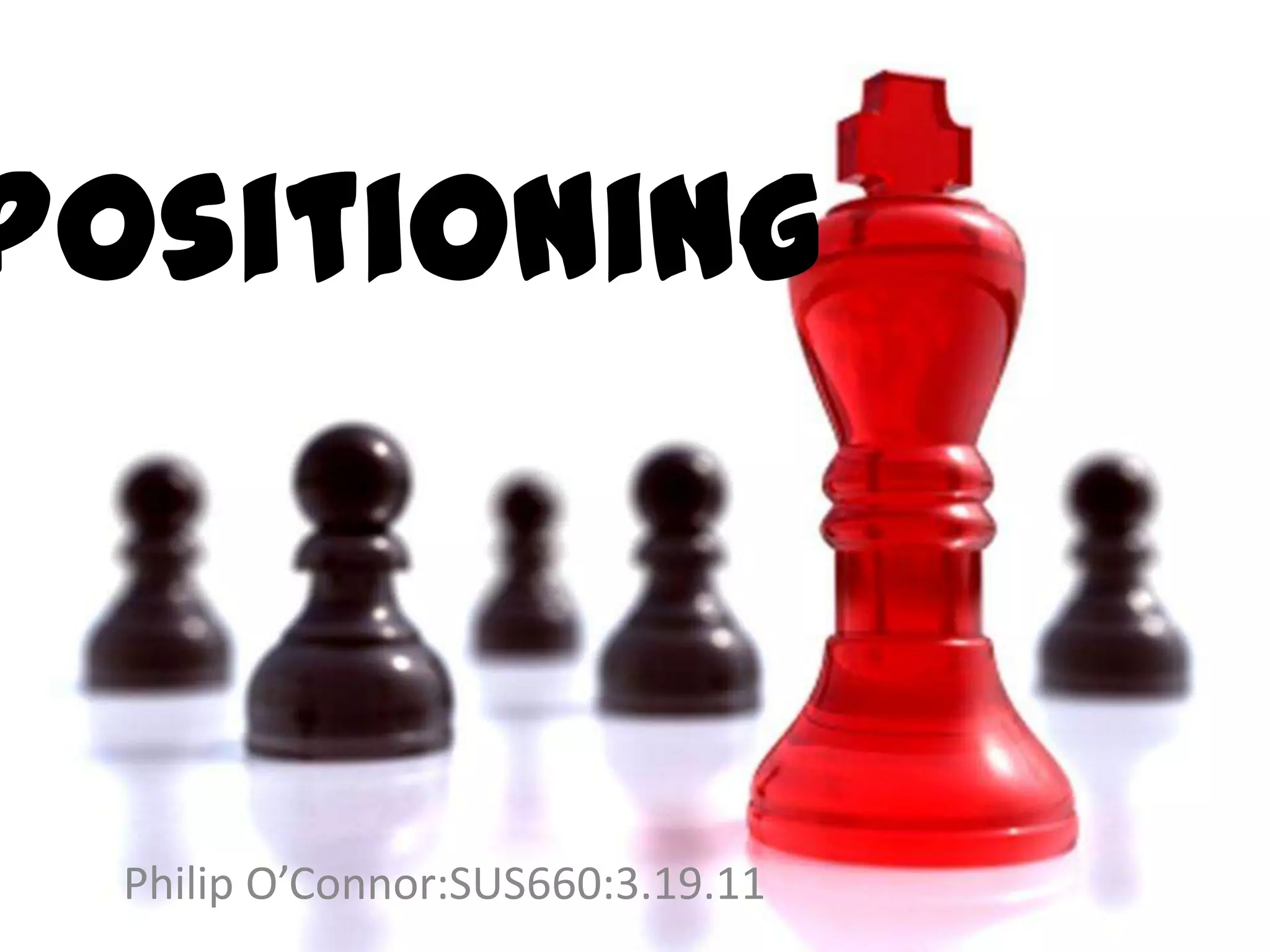 Positioning is designing how a target audience thinks and feels about a product to occupy a distinct place in their mind. It should be developed based on research into customers' desired qualities, including their geographic, psychographic, demographic, and behavior characteristics. Effective positioning identifies the unique benefits and differentiation of a product compared to others, implanting this in customers' minds to show the higher value of adoption over competing options. Positioning guides the development of marketing messages and helps unify decision making, though it is meant for internal use only.