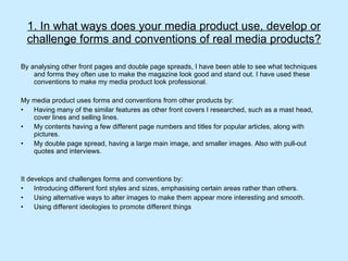 The document provides an evaluation of a media production project creating a music magazine. It summarizes the key ways the media product uses conventions from real magazines, represents particular social groups through language, design and content choices, and would likely be distributed by a major publisher given its wide appeal across music genres. The evaluation also reflects on the technical skills and understandings developed through constructing the media product compared to an earlier preliminary task. Feedback indicated the magazine was generally well-received by its target 16-25 year old audience for its originality and representation of varied music genres, though some disliked the dark background color.