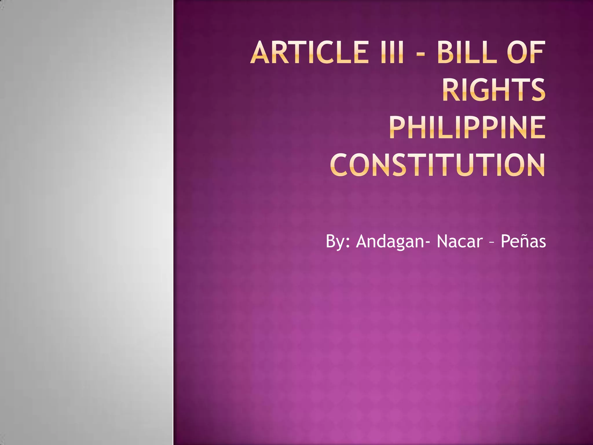 This document outlines various rights and protections guaranteed by the Philippine Constitution. It discusses protections against deprivation of life, liberty or property without due process; protections against unreasonable searches and seizures; privacy of communication; freedom of speech, religion and assembly; rights of workers to form unions; protections against takings of private property without compensation; rights of the accused including presumption of innocence and rights to counsel and fair trial; prohibition of torture; rights to bail and habeas corpus; prohibition of double jeopardy and ex post facto laws.