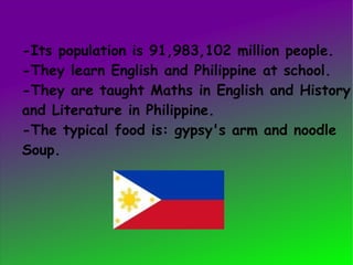 The Philippines has a population of over 91 million people who learn English and Philippine in school, with math taught in English and history/literature in Philippine. Notable people from the Philippines include actress Vanessa Minnillo, singer/actress/model Nikki Gil, and actor Marvin Agustin. The capital is Manila and other major cities are Cebu, Puerto Princess, and Davao, which offer sites like the Obelisk in Cebu, Colon Street, the Palawan Museum cathedral in Puerto Princess, and Lon Wa church in Davao.