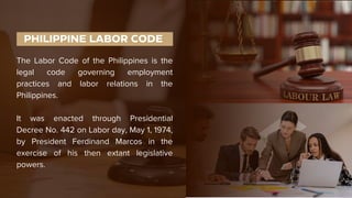 The document outlines the Philippine Labor Code, established in 1974, which governs employment practices and labor relations. It details provisions on working conditions, wages, and employee rights, including hours of work, overtime pay, rest periods, and holiday compensation. Additionally, it specifies the non-diminution of employee benefits and enforcement of minimum wage regulations across various sectors.