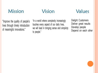 Royal Philips Electronics is a Dutch diversified technology company founded in 1891. It has major divisions in consumer electronics, lighting, medical systems, and domestic appliances. Headquartered in Amsterdam, Philips has over 100,000 employees worldwide and operates in over 60 countries. It generates revenue of over €21 billion annually from products like home appliances, lighting, and medical equipment. Philips has undergone restructuring over the years to focus on innovation and build its brand in healthcare, lighting, and consumer products.