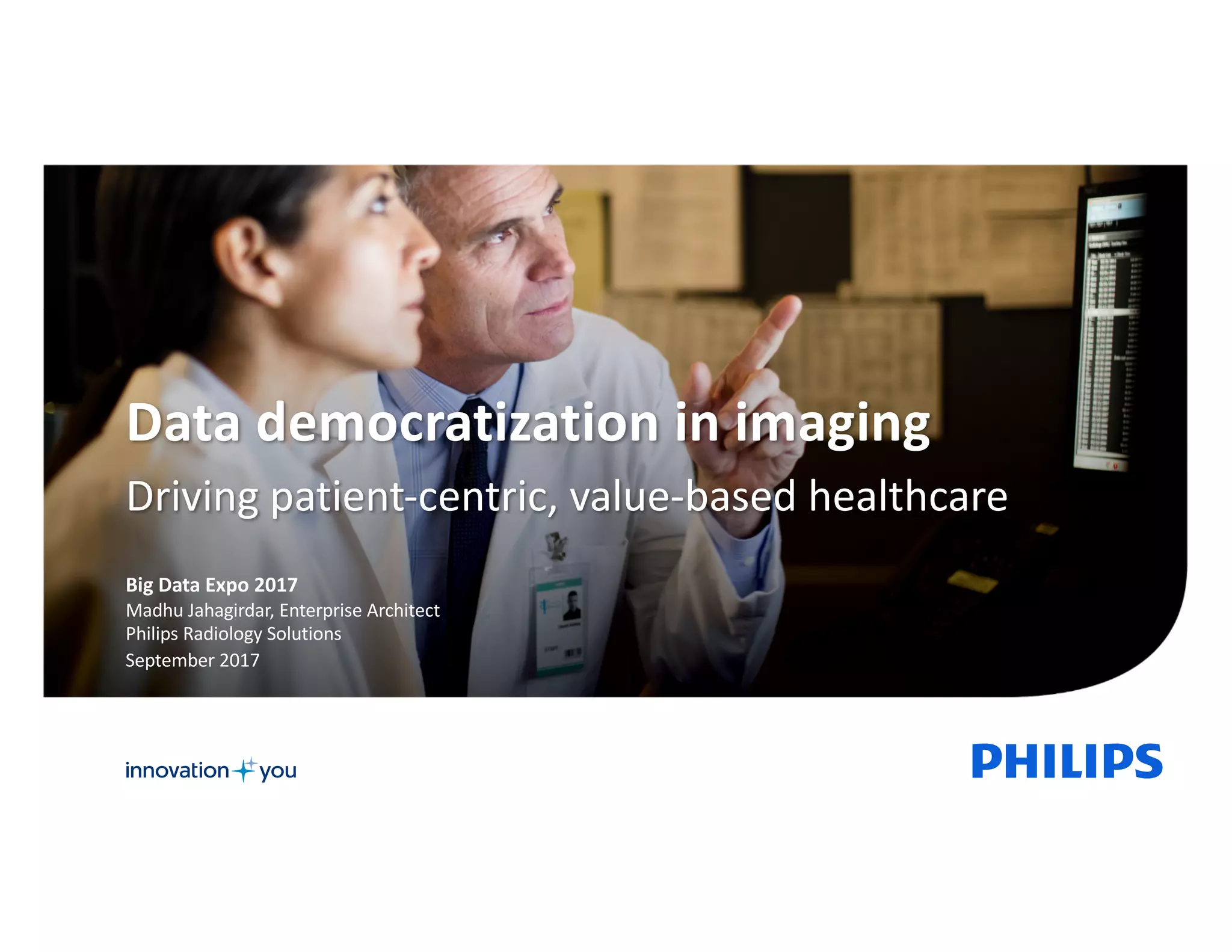 This document discusses data democratization in healthcare imaging. It describes the challenges facing healthcare like declining inpatient volumes and the need for better patient experiences. It advocates empowering physicians and patients with data-driven insights to enhance decision making centered around patients. Data democratization is defined as lowering barriers to comprehensive, consistent and reliable healthcare data for all stakeholders. Achieving it requires business model innovation, developing an open ecosystem through community innovation, and technology innovation to provide secure access to standardized data. The benefits include making data actionable to focus on outcomes, value and better patient experiences.
