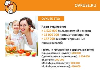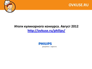 Документ содержит итоги кулинарного конкурса на сайте ovkuse.ru, проходившего с 1 по 14 августа 2012 года. В конкурсе участвовали 121 работа, из которых в финал прошли 37, а победители были определены по количеству лайков. Общая активность пользователей составила 20 354 уникальных посетителя, а количество полученных лайков возросло до 7 974.