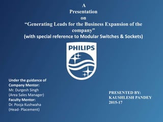 This document provides a summary of a presentation by Kaushlesh Pandey on generating leads for business expansion of Philips India Pvt Ltd, with a focus on modular switches and sockets. The objectives are to improve sales, study the market potential in Pune, generate leads, and increase awareness and business. The presentation includes background on Philips, its products, divisions, competitors like Anchor and Legrand, learnings from interacting with projects and retailers, and conclusions on the experience gained.