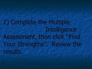The document provides instructions for students to complete a Multiple Intelligence assessment online, copy the results into a Word document, and answer reflection questions in a response paper about their experience with the assessment and instructions. Students are asked to consider if the instructions could stand alone, if any part was missing information, and how the experience could be improved. They are also reminded to start the assignment early in the week.