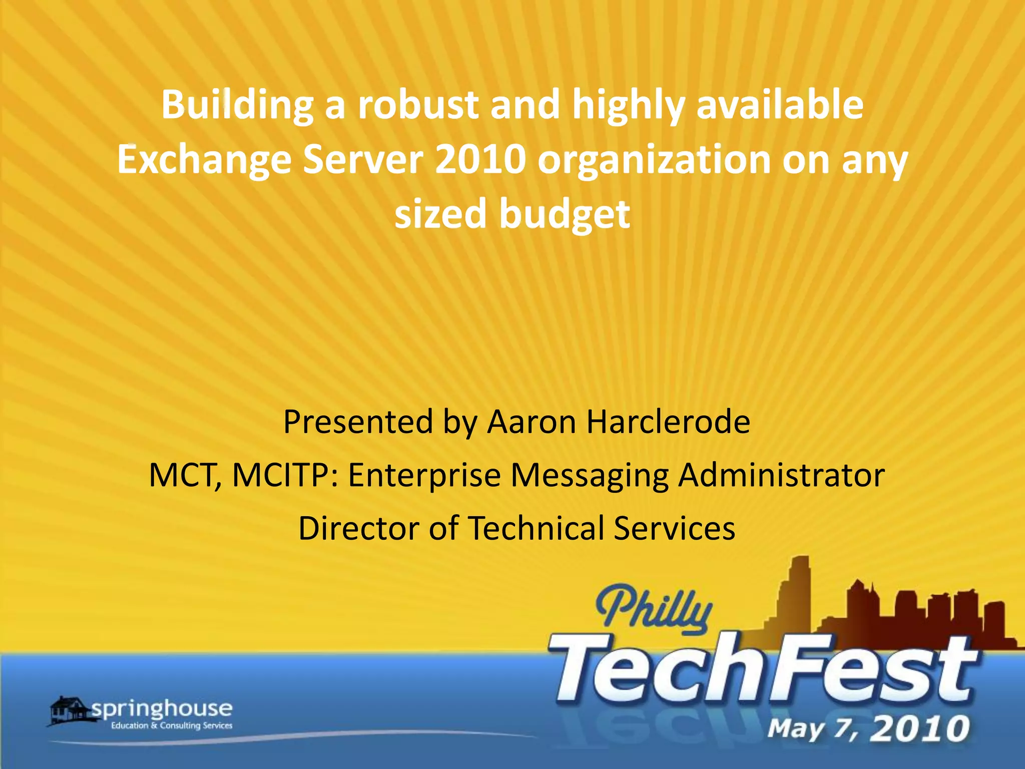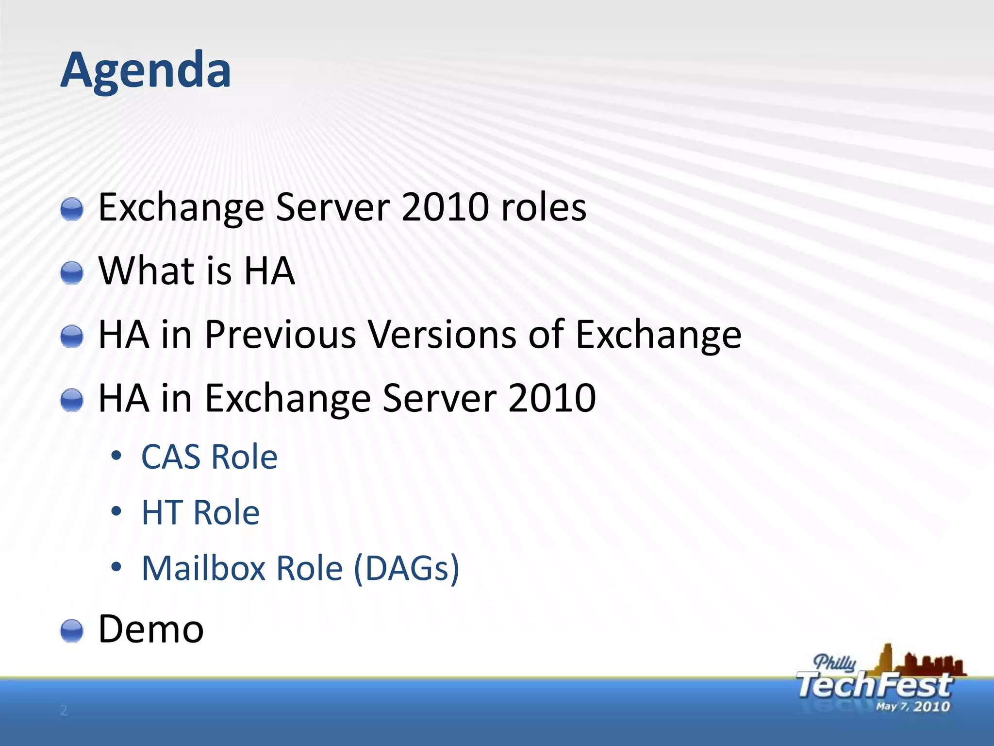 The document discusses how to build a highly available Exchange Server 2010 environment and outlines the different server roles, high availability features in previous versions of Exchange, high availability in Exchange 2010 including database availability groups, and demonstrates how to configure databases for high availability.