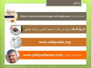 این سند به تحلیل و طراحی شیءگرا و ارتباط آن با فلسفه میپردازد و به تأثیر دکترینهای فلسفی افلاطون و ارسطو بر این موضوع اشاره میکند. الگوهای طراحی مبتنی بر فلسفه و نمونهسازی در زبانهای برنامهنویسی مانند جاوااسکریپت نیز مورد بررسی قرار میگیرند. در نهایت، مباحثی چون وراثت، دستهبندی و تغییر در زمینههای فلسفی و برنامهنویسی مطرح میشود.