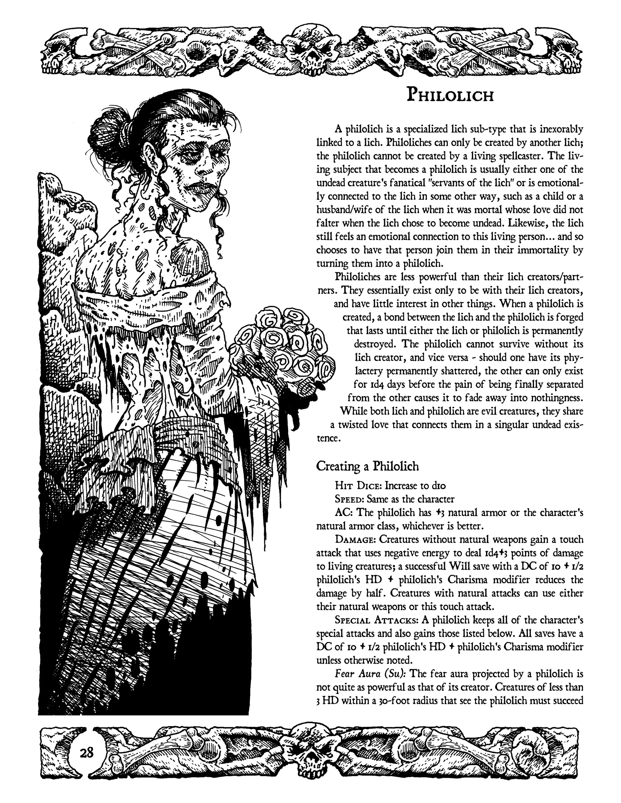 A philolich is a type of undead creature created when a lich transforms a living individual who is devoted to the lich, such as a servant, family member, or spouse. The lich and philolich are psychically linked - if one is destroyed, the other will fade away within a few days. Philoliches are less powerful than liches but are utterly devoted to serving their creator. Their twisted love for each other binds them together in undeath.