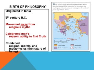 The birth of philosophy originated in Ionia in the 6th century BC as a movement away from religious myths towards using reason to find truth. Early philosophers questioned the nature of reality and the cosmos and sought to understand the fundamental substances that made up the world. Thales believed water was the basic element, while Anaximander said it was an indefinite substance. Socrates used the Socratic method of questioning to teach virtue, and was later executed for corrupting youth. Plato and Aristotle established some of the first philosophical schools and made significant contributions to many areas of philosophy and early science. Various other schools of philosophy developed such as the Cynics, Skeptics and Epicureans, each offering different perspectives on