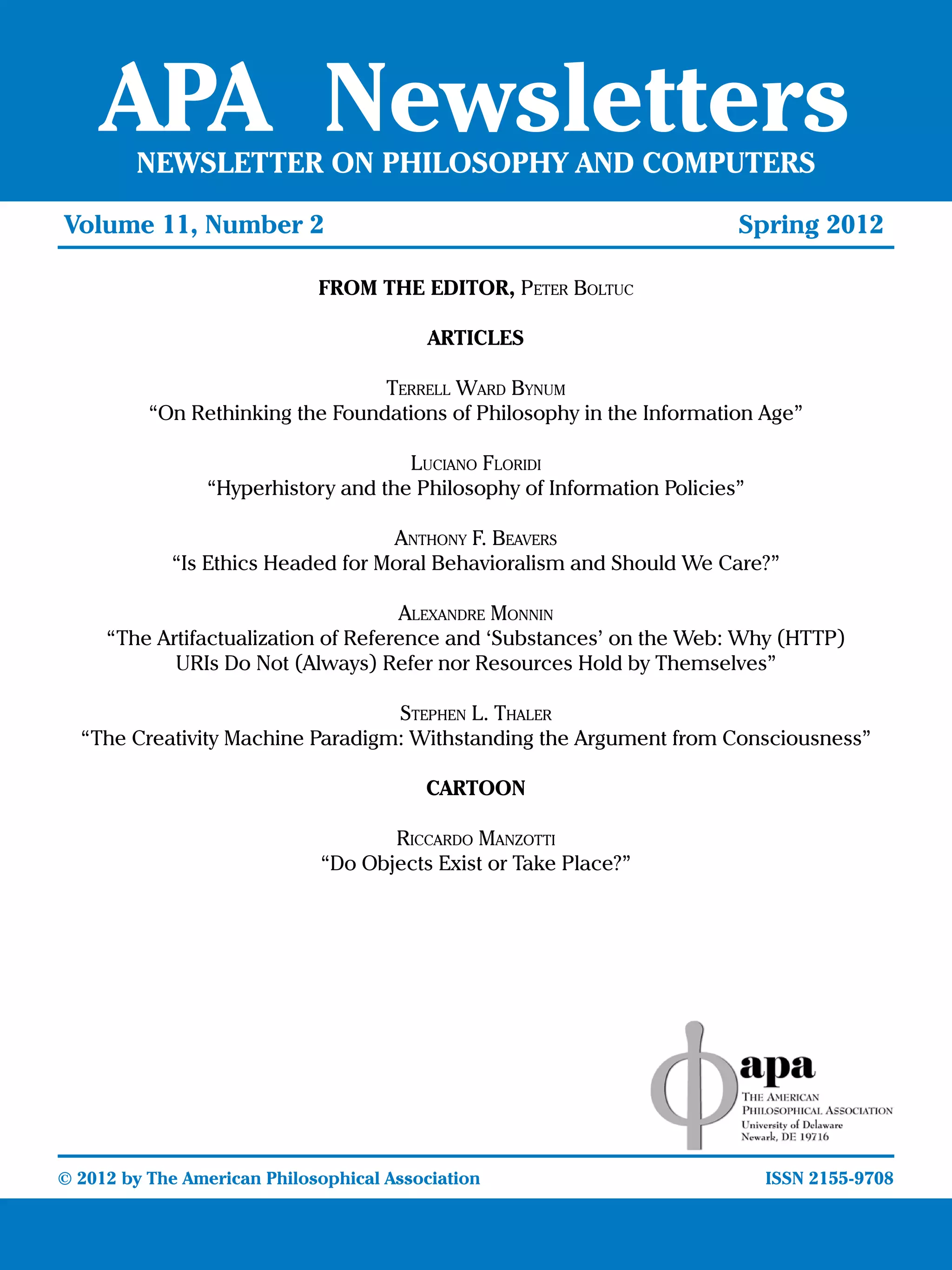The APA newsletter discusses various philosophical issues related to computers and information technology, highlighting articles by prominent philosophers such as Terrell Ward Bynum and Luciano Floridi. The newsletter reflects on the impact of the information revolution on philosophy and ethics, emphasizing the transformative nature of information as fundamental to understanding reality. It also touches on the interplay between recent developments in physics and philosophical thought, suggesting that the nature of the universe may be increasingly viewed through the lens of information.