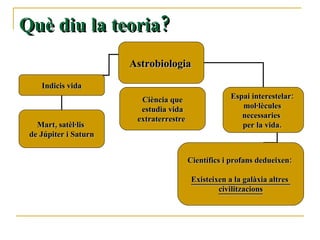 Què diu lateoria? Astrobiologia Indicis vida Ciència que estudia vida extraterrestre Espai interestelar: mol·lècules necessaries per la vida. Mart, satèl·lis de Júpiter i Saturn Científics i profans dedueixen: Existeixen a la galàxia altres civilitzacions