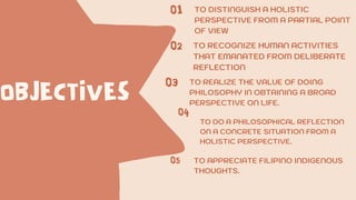 This document discusses pursuing wisdom and facing challenges in the 21st century. It begins by outlining the objectives of the group, which include distinguishing a holistic perspective from a partial point of view. It then provides introductions to philosophy, discussing concepts like the meaning of philosophy, how knowledge is acquired, and the various branches of philosophy such as metaphysics, ethics, epistemology, logic, and aesthetics. It also discusses expanding philosophical frames to include both western and non-western traditions, with a focus on Filipino indigenous thoughts and a holistic perspective.