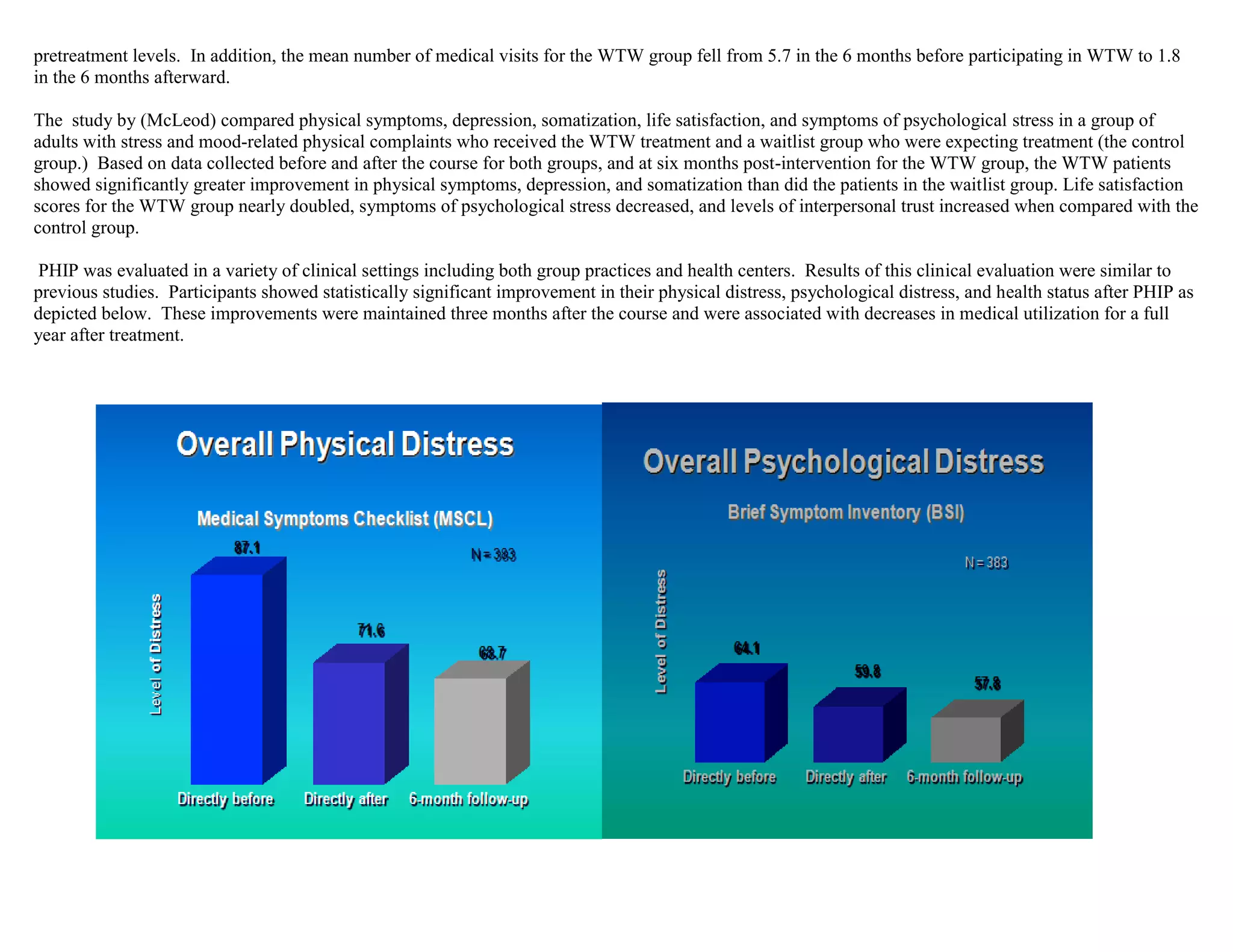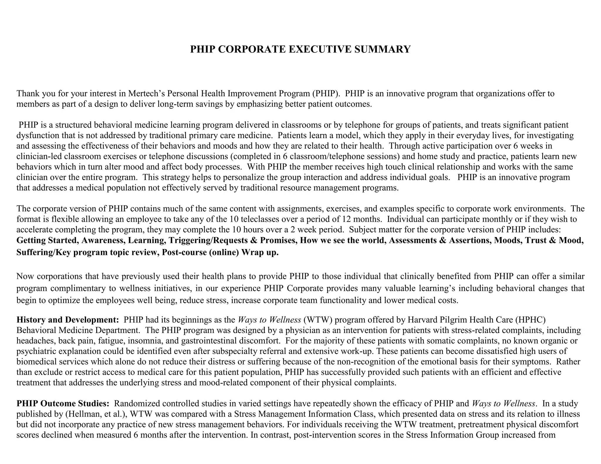 This document provides an executive summary of the Personal Health Improvement Program (PHIP). PHIP is a 6-week structured behavioral medicine program delivered in classrooms or by telephone that teaches patients to investigate their behaviors, moods, and how they relate to health. It helps patients learn new behaviors to alter moods and body processes. The corporate version of PHIP contains similar content tailored for the workplace. Studies show PHIP significantly improves physical symptoms, depression, stress, and decreases medical visits compared to control groups. Participants in PHIP clinical evaluations maintained improvements in physical and psychological distress and health status over time.