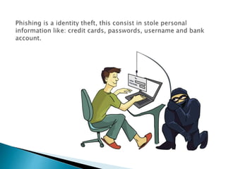 This document discusses common cybersecurity threats like phishing and spoofing. Phishing involves hackers stealing personal information by "fishing" online, while spoofing tricks users into unintentionally downloading viruses or malware. To stay safe, the document recommends not clicking unknown links, using strong passwords, keeping computers updated, and using antivirus software.