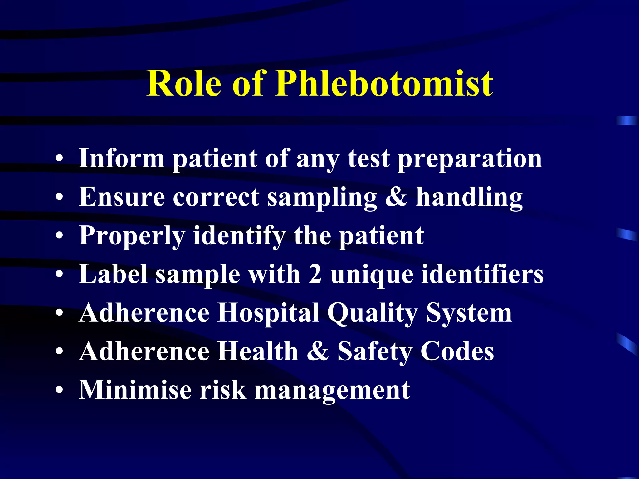 The document provides information about the roles and responsibilities of phlebotomists in a biochemistry laboratory. It discusses key duties like ensuring proper patient identification, sample handling and transport procedures. It also outlines various preanalytical and analytical considerations for sample collection and testing, including different anticoagulants, test types, quality standards and transport methods. The document emphasizes the importance of adherence to protocols and informing the laboratory of any issues that could impact test results.