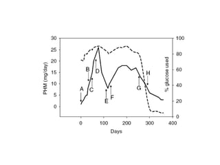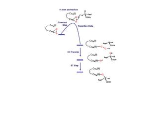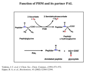 The document details the research on peptidylglycine hydroxylating monooxygenase (PHM), focusing on its production, characterization, and mechanistic studies. It outlines various methods to optimize enzyme production in bioreactors, discusses the roles of copper and substrate interactions in catalysis, and presents findings related to electron transfer and reaction intermediates. Additionally, it describes experimental techniques used to investigate enzyme kinetics and the impact of pH on enzyme activity and stability.