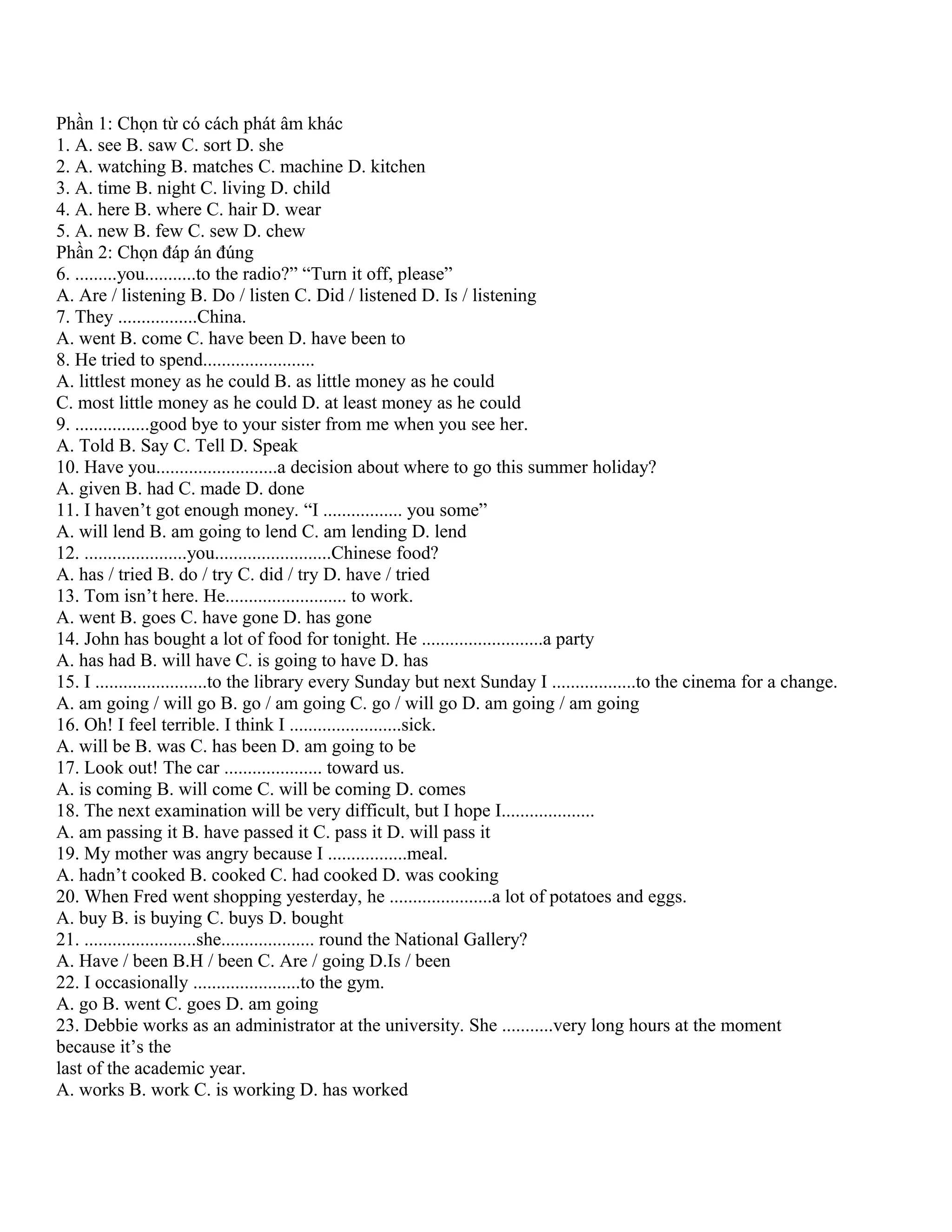 The document contains a test with multiple choice questions about English grammar and vocabulary. It covers topics such as verb tenses, prepositions, parts of speech, and sentence structure. The test contains over 75 questions testing various aspects of English proficiency.