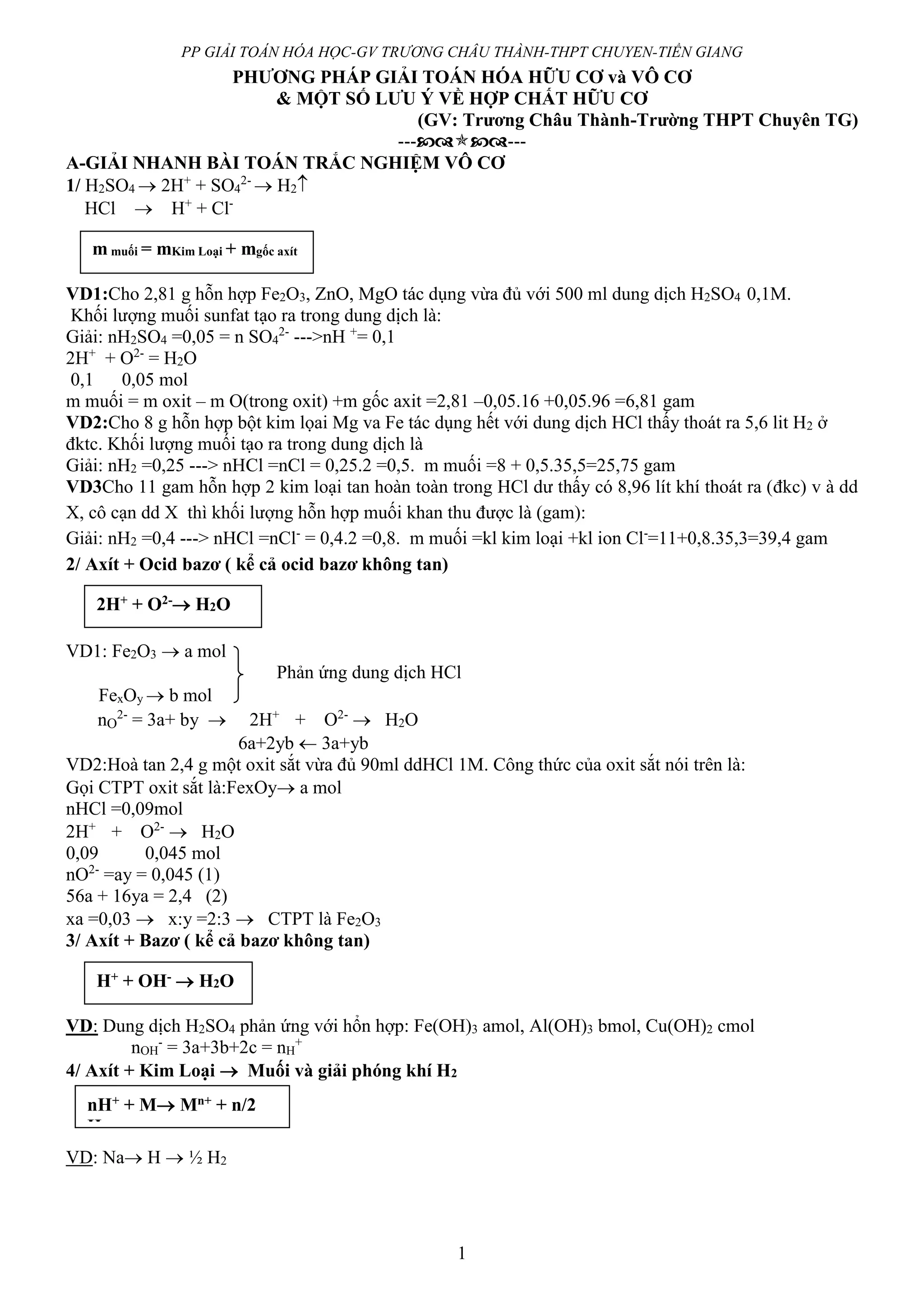 Tài liệu trình bày phương pháp giải toán hóa học hữu cơ và vô cơ với nhiều ví dụ thực tế, gồm cách tính khối lượng muối tạo ra trong các phản ứng hóa học. Nó áp dụng các định luật bảo toàn khối lượng, bảo toàn điện tích và điện tử trong các phản ứng hóa học. Ngoài ra, tài liệu cũng hướng dẫn cách xác định công thức phân tử của hợp chất hữu cơ dựa trên khối lượng và số mol.