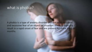 A phobia is an excessive, irrational fear or anxiety related to specific objects or situations that is persistent and disproportionate to any actual threat. Phobias are classified as specific, social, or agoraphobia. They can be triggered by traumatic incidents, genetics, or stress and cause symptoms like trembling, difficulty breathing, and nausea. While fear protects us from real dangers, phobias are excessive and interfere with daily life. Phobias are treatable through therapies like exposure, cognitive behavioral therapy, and medications.