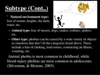 There are three main types of phobias: specific phobias, social phobias, and agoraphobia. Specific phobias involve an irrational fear of a specific object or situation, like heights or insects. Social phobias involve a fear of social situations where one may be judged. Agoraphobia is a fear of being in places away from the safety of home or where escape may be difficult, like crowds. Phobias are treated with therapy and medication to help reduce anxiety and change irrational thoughts that cause the fears.