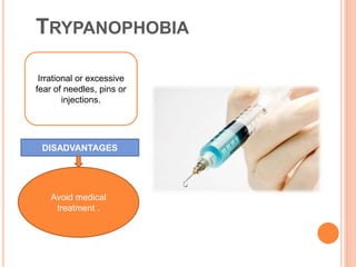 This document discusses three common phobias: trypanophobia which is an irrational fear of needles or injections causing people to avoid medical treatment; arachnophobia which is an extreme fear of spiders that can lead to children being teased; and claustrophobia which is an irrational fear of being closed in or having no escape that causes people to avoid places like subways or elevators even if they need to travel many floors.