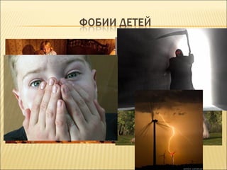 Документ описывает фобии как чрезмерные и беспричинные страхи, вызванные определенными объектами или обстоятельствами. Также представлены симптомы навязчивых состояний и рекомендации по их преодолению, включая способы обучения детей эффективному реагированию на страхи. В целом, материал нацелен на повышение эмоциональной устойчивости и преодоление страха через позитивные методы.