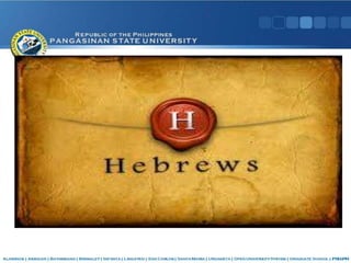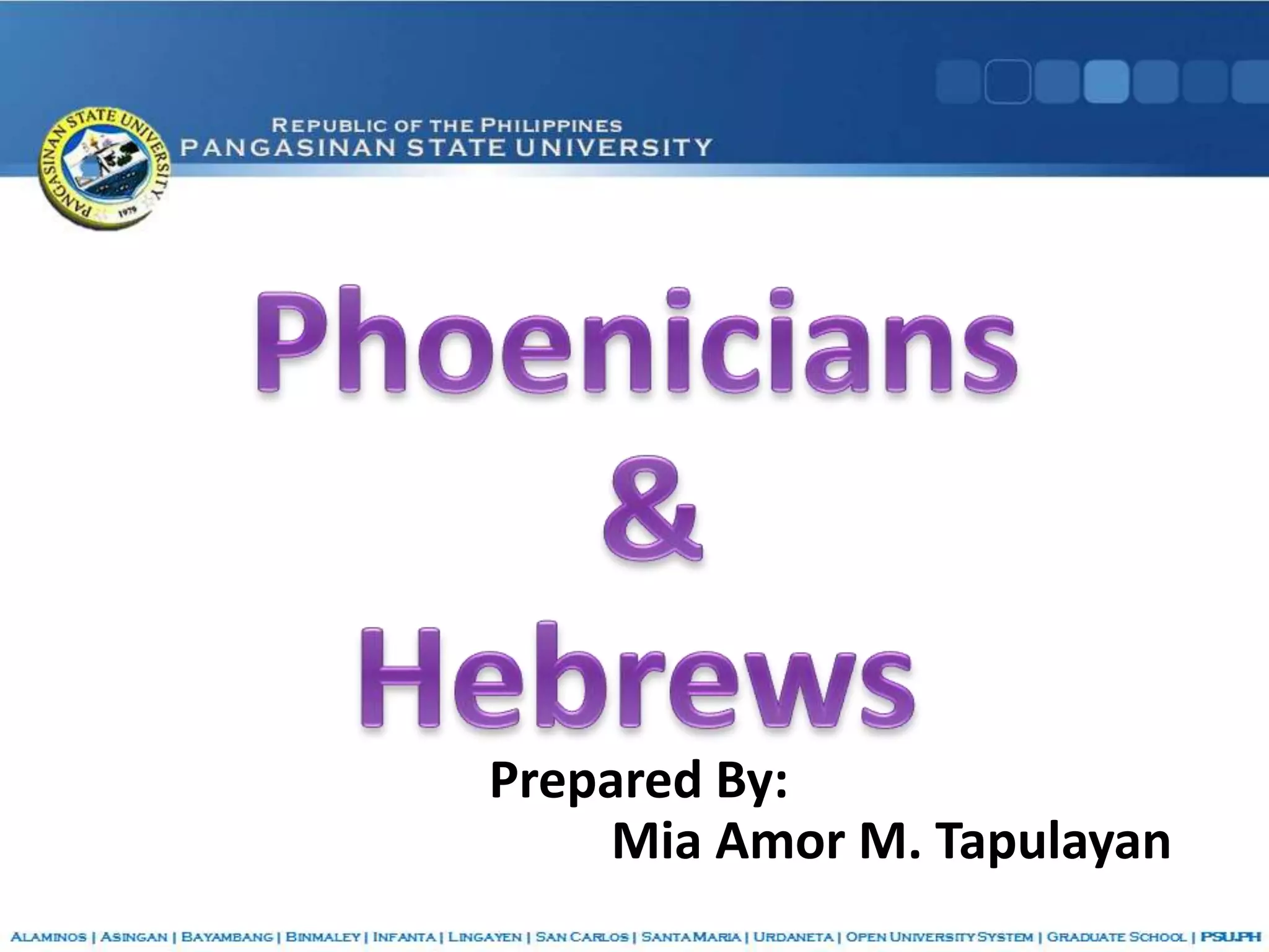 The Phoenicians originated in the land of Phoenicia along the eastern shore of the Mediterranean Sea. They became skilled sailors, shipbuilders, and merchants who established colonies throughout the Mediterranean world and introduced Asian goods and cultural influences from places like Egypt and Persia. A major Phoenician contribution was developing the first alphabet of 22 letters, which later alphabets were based on. The Jews originated as a Semitic people in Arabia and later settled in Palestine and Egypt before fleeing Egypt led by Moses. They established kingdoms in Israel but these were later conquered and the Jews were exiled, becoming refugees dispersed throughout Asia and Europe in what was known as the Jewish diaspora.