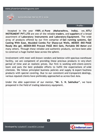 Xitij Instrument Pvt. Ltd., established in 1989 in Pune, India, is a leading supplier and trader of laboratory equipment and instruments known for their accuracy, durability, and corrosion resistance. The company offers a vast product range including gel electrophoresis systems, biotech equipment, audio-visual equipment, and teaching kits, catering to the needs of various industries and clients across East Asia. With a commitment to quality and client satisfaction, the company has developed a strong market presence through reliable products and customer-centric practices.
