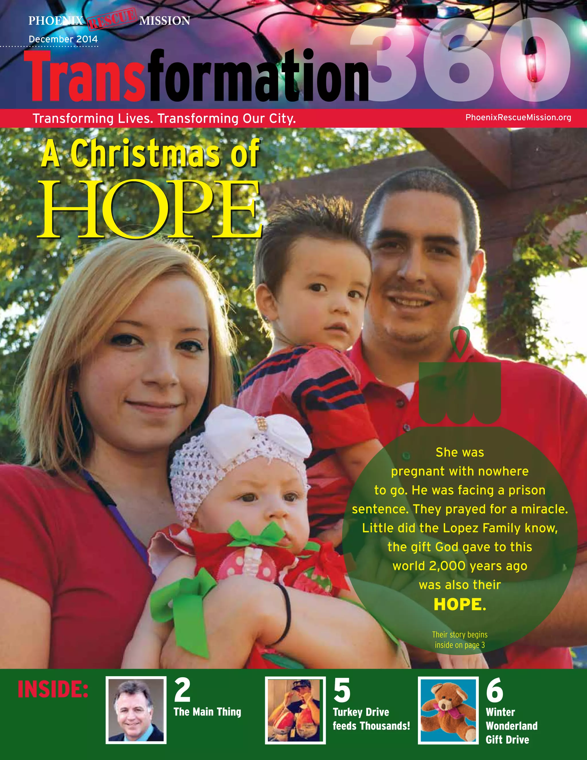 The document details the impactful work of the Phoenix Rescue Mission during the Christmas season, highlighting various programs like their turkey drive and winter wonderland event aimed at supporting families in need. It features a story of hope from the Lopez family, who overcame addiction and found support through the mission, showcasing the transformation enabled by their services. The mission emphasizes its commitment to meet increasing needs in the community and thanks supporters for their contributions during this pivotal time.