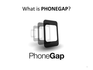 PhoneGap allows developers to write mobile apps using web technologies like HTML, CSS, and JavaScript instead of native languages. It works by wrapping web content in a native container so apps can access device capabilities and be distributed through app stores. PhoneGap was created in 2009 by Nitobi and later donated to the Apache Foundation, becoming known as Cordova. While PhoneGap and Cordova are often used interchangeably, Cordova is the open source engine that powers PhoneGap. Using PhoneGap offers benefits like reusing web skills, shorter learning curves, and faster development.