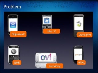 PhoneGap is a framework for building cross-platform mobile apps using HTML, CSS, and JavaScript. It allows accessing device hardware and features through JavaScript APIs. Apps built with PhoneGap run within a webview but feel like native apps. It supports developing for iOS, Android, BlackBerry, Symbian and WebOS from a single codebase. While PhoneGap simplifies development, apps may have slower performance and limited complex UI compared to truly native apps.